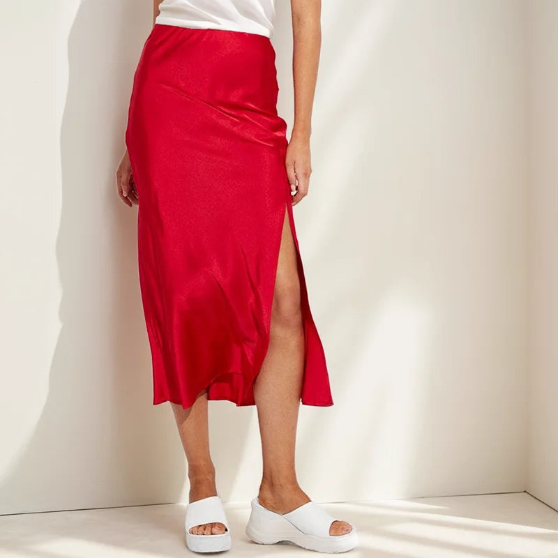 Ontdek Diora, de satijnen midi rok die luxe en eenvoud combineert. Gemaakt van hoogwaardig satijn straalt deze rok pure verfijning uit met een mooie glans. De flatterende A-lijn snit zorgt voor een elegante pasvorm die soepel met je meebeweegt – ideaal voor elke gelegenheid.